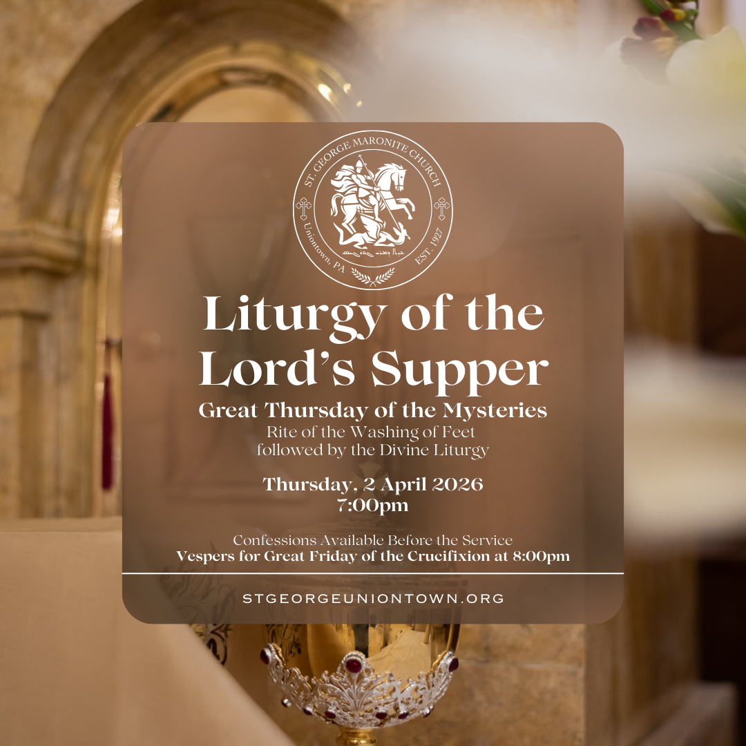 Great Friday of the Crucifixion Vespers Thursday, April 2, 2026 8:00 PM 9:00 PM St. George Maronite Church 6 Lebanon Terrace Uniontown, PA, 15401 United States (map) Google Calendar ICS