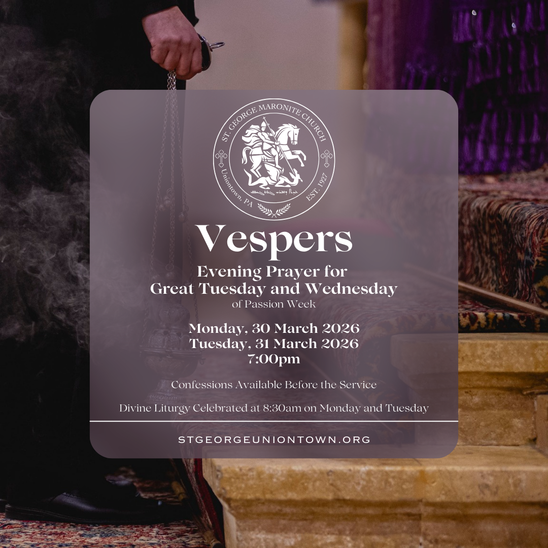 Great Wednesday Vespers Tuesday, March 31, 2026 7:00 PM 8:00 PM St. George Maronite Church 6 Lebanon Terrace Uniontown, PA, 15401 United States (map) Google Calendar ICS
