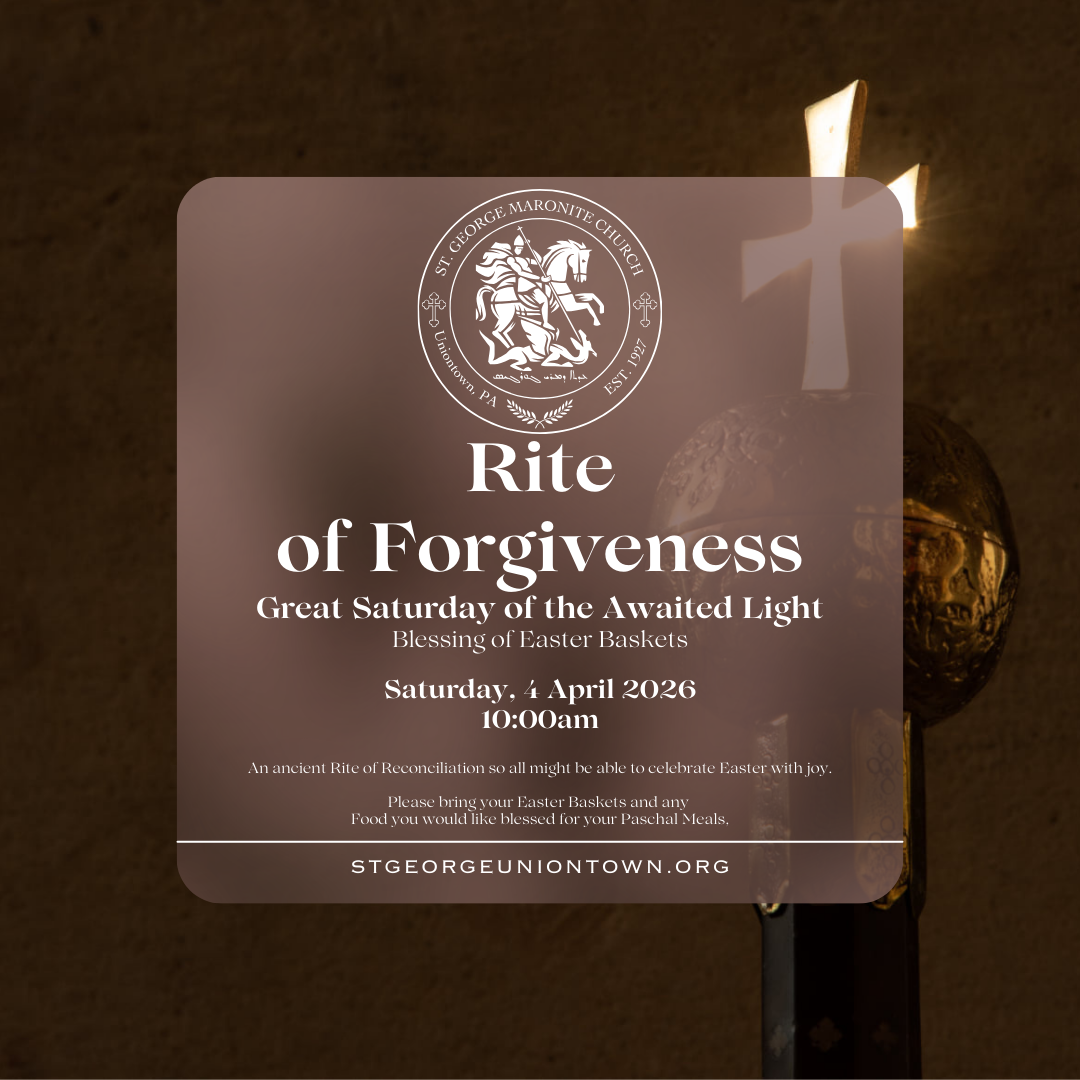 Rite of Forgiveness Saturday, April 4, 2026 10:00 AM 11:30 AM St. George Maronite Church 6 Lebanon Terrace Uniontown, PA, 15401 United States (map) Google Calendar ICS